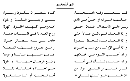 ابدع امير الشعراء الشاعر أحمد شوقي و كتب قصيدة قم للمعلم و فه التبجيلا و قام بتلحينها الفنان محمد شهوان. كاد المعلم أن يكون رسولا. أحمد شوقي أحمد بن علي بن أحمد شوقي. أحمد بن علي بن أحمد شوقي.